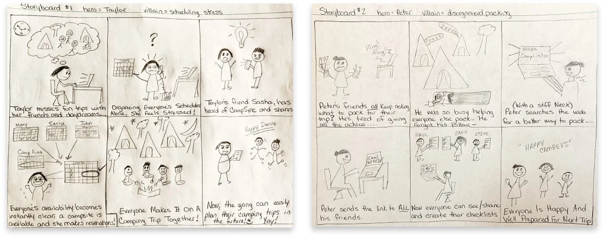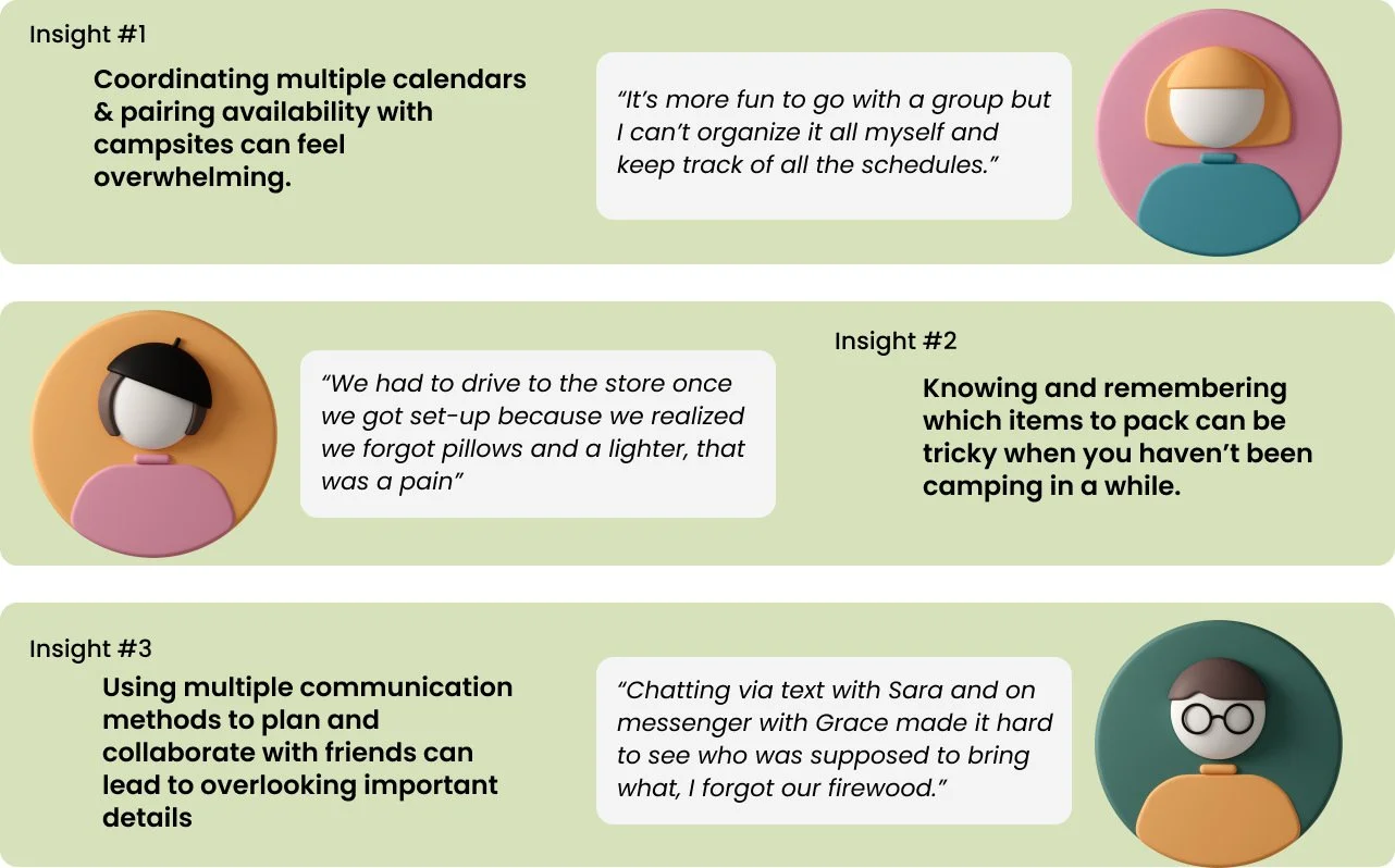 Next, I conducted user interviews to empathize with campers and understand their needs when planning a camping trip. These interviews were instrumental and gave me thorough insights into the problems I needed to tackle in my design.