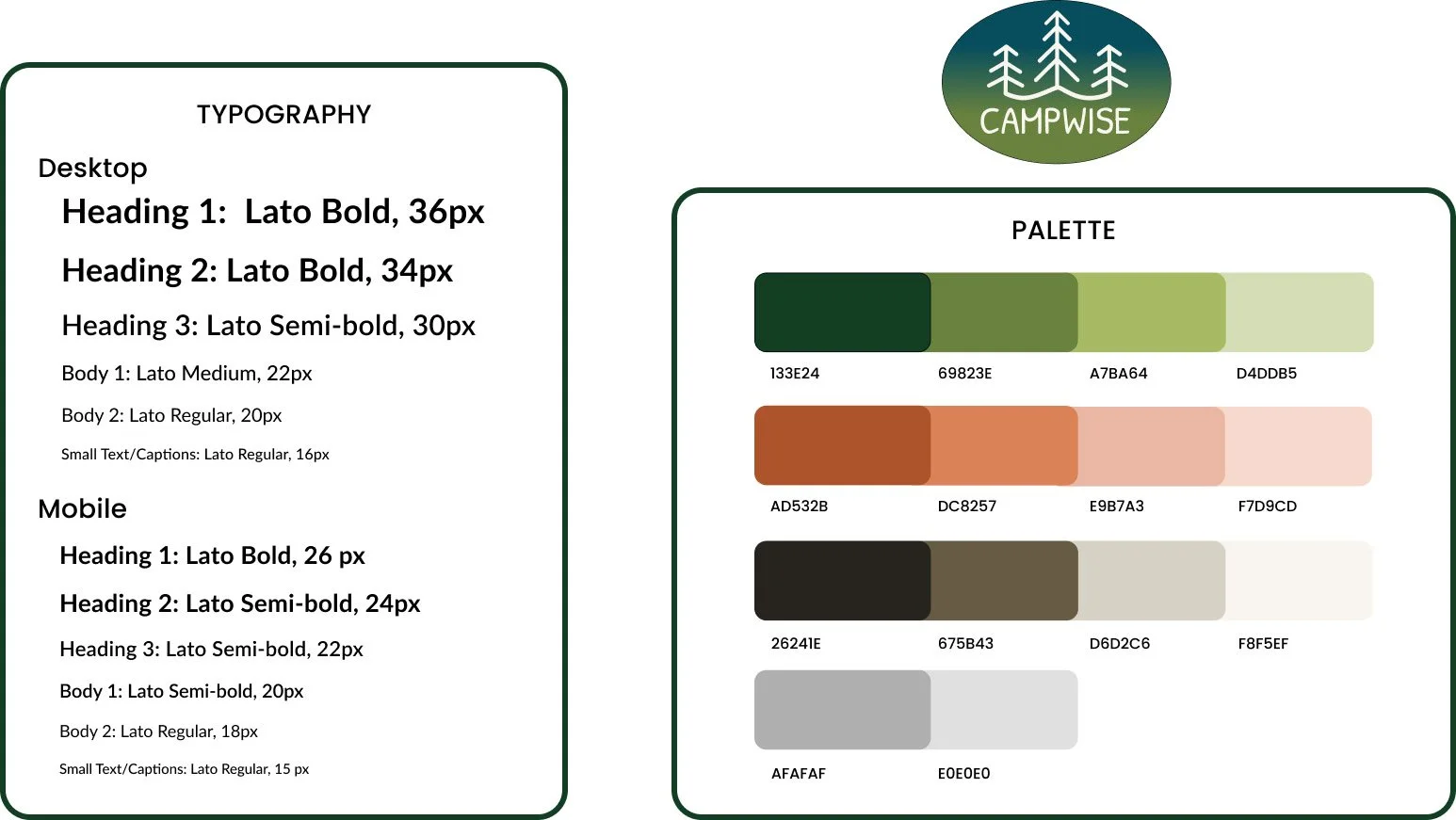I selected the "Lato" font to serve as the cornerstone of the website’s typography. Its balanced proportions and wide range of weights effectively facilitate hierarchy and consistency, while contributing to an inviting and user-friendly design that reflects CampWise's ethos of accessible exploration.
