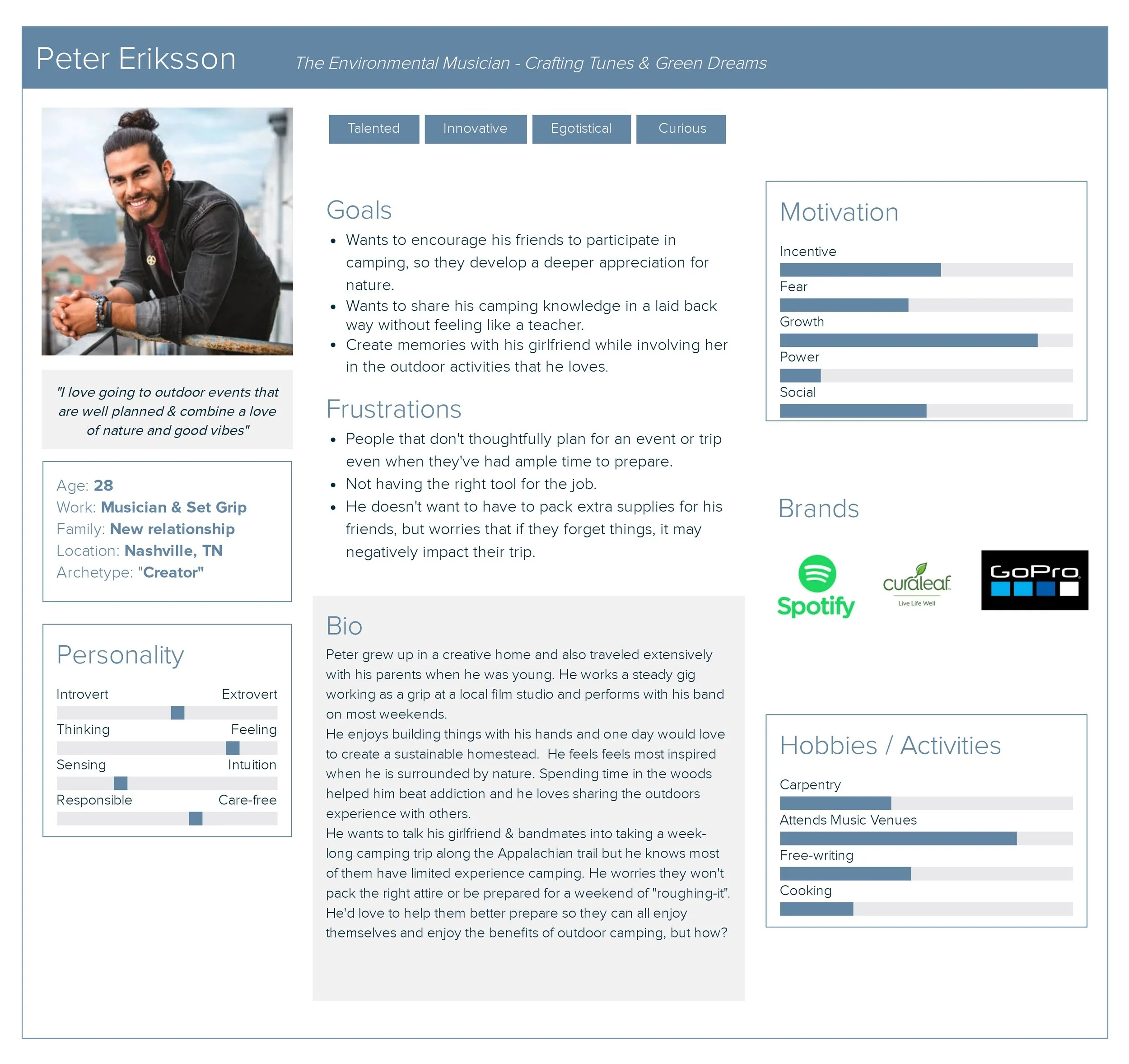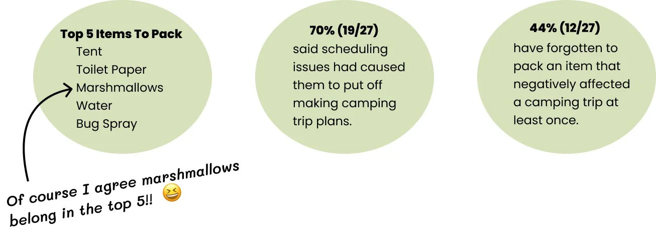 Creating a survey using Google Forms, I surveyed people who had some camping experience. I received (27) total responses which gave me a good start and highlighted some commonly shared motivations, pain points, camping habits and goals.